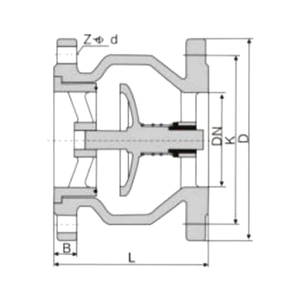Kotouč ventilu je veden středovou osou na obou koncích vstupu a výstupu, flexibilně se otevírá a zavírá a může být instalován vodorovně nebo svisle. Kotouč ventilu je odpružený a jeho rychlé uzavření může účinně snížit tlak vodního rázu, s dobrým těsnícím výkonem a bez hluku při zavírání. Odolný proti opotřebení a dlouhá životnost.